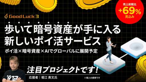 募集タイトル:〈堀江貴文氏も注目〉「歩いて暗号資産が手に入る」新しいポイ活サービス。前期売上比+69%成長見込み「グッドラックスリー」