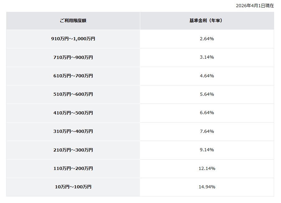 2026年4月1日現在の金利水準をスクショしてみました。利用限度額によって金利水準が異なりますが、出来る限り多く借りれる人の方が金利水準が低くなります。